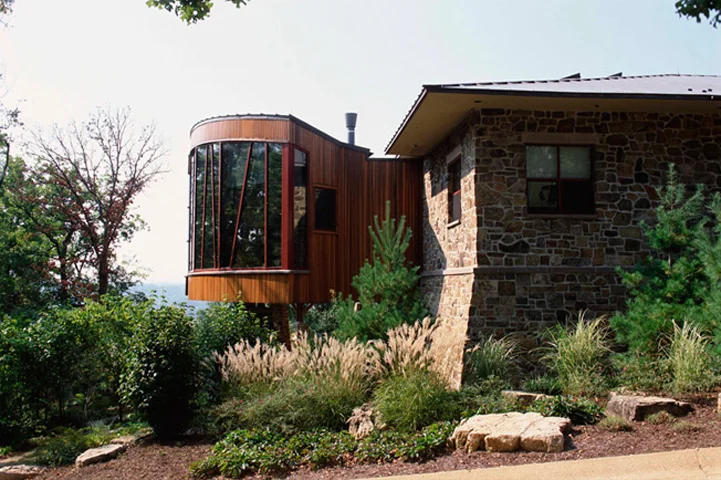 The landscape master plan for the Sinquefield Farm, a private estate and conference center located on the Osage River in Central Missouri, references a range of design precedents and concepts to create a tapestry of landscape elements that are discovered as one wanders about the 300-acre site. The plan establishes a native palette of plant species as the framework for roads, trails and pathways, a series of river vantage points, and the main residence which is perched on a bluff with overviews of the river bottom and floodplain agricultural fields below. Within the river bottom, an “American parterre” garden is designed using a combination of agricultural crop and wetland plant species. Franke : Franke located and designed the graceful road leading from the main entry with a series of landscape conditions including an oak entry bosque, a color-striated hedge “gateway” to the forest, and a vine-covered boulder point-grid that mysteriously emerges from the deep woodlands and extends across the road as it moves through the forest. The road passes at the edge of a new apple orchard and provides framed views to the river bottom below as it leads to the main residence entry. The residence gardens are designed to reestablish the presence of native species selected to envelope the house in a choreographed and exaggerated order of seasonal change.
